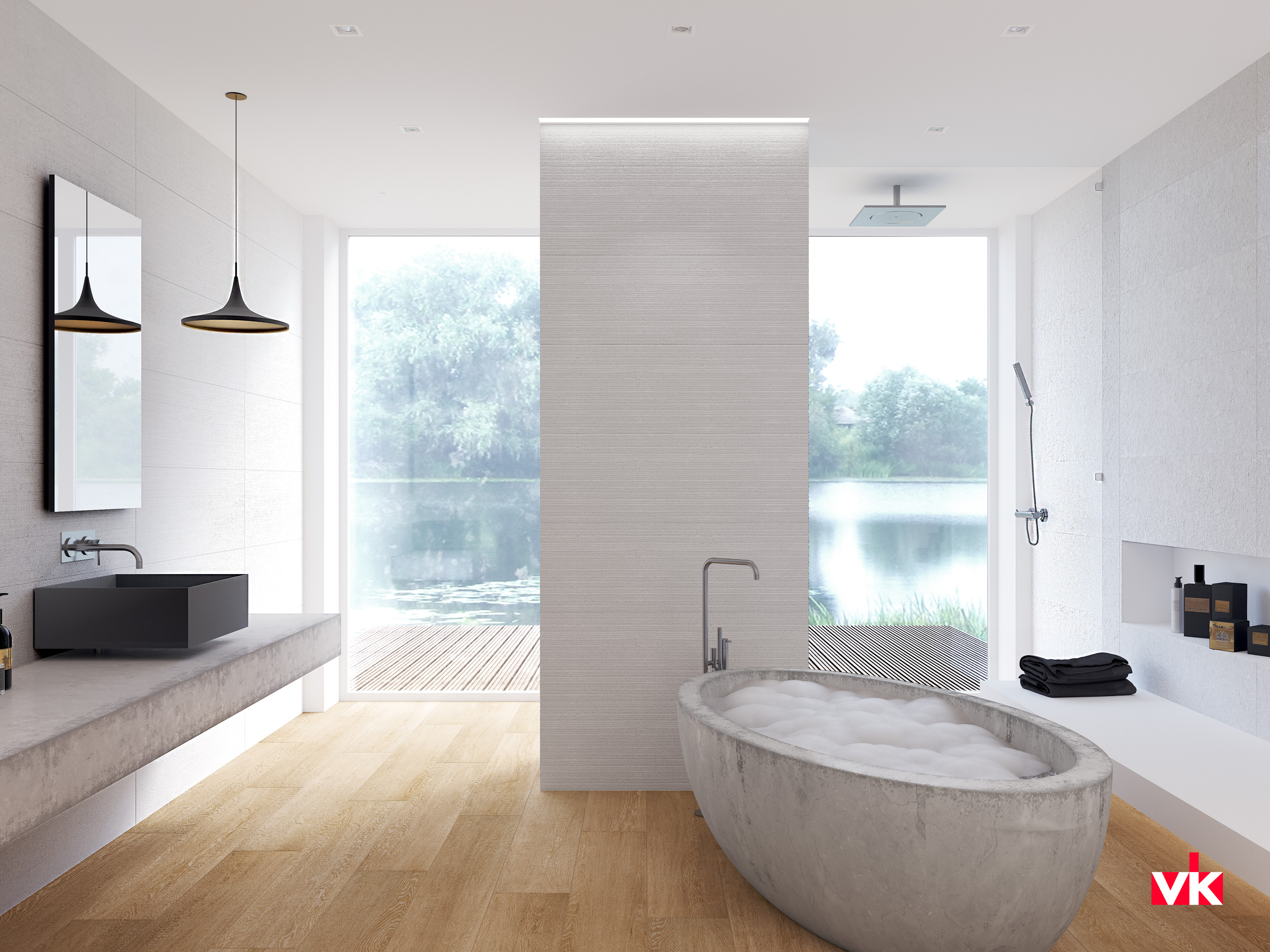 Фактура керамической плитки выглядит строго, придавая помещению облик характерный для современного интерьера. Особенно красиво смотрится комбинация светлой плитки с мебелью темных цветов. Монохромные композиции отлично подходят для ванных комнат, хорошо сочетаясь с белой сантехникой.