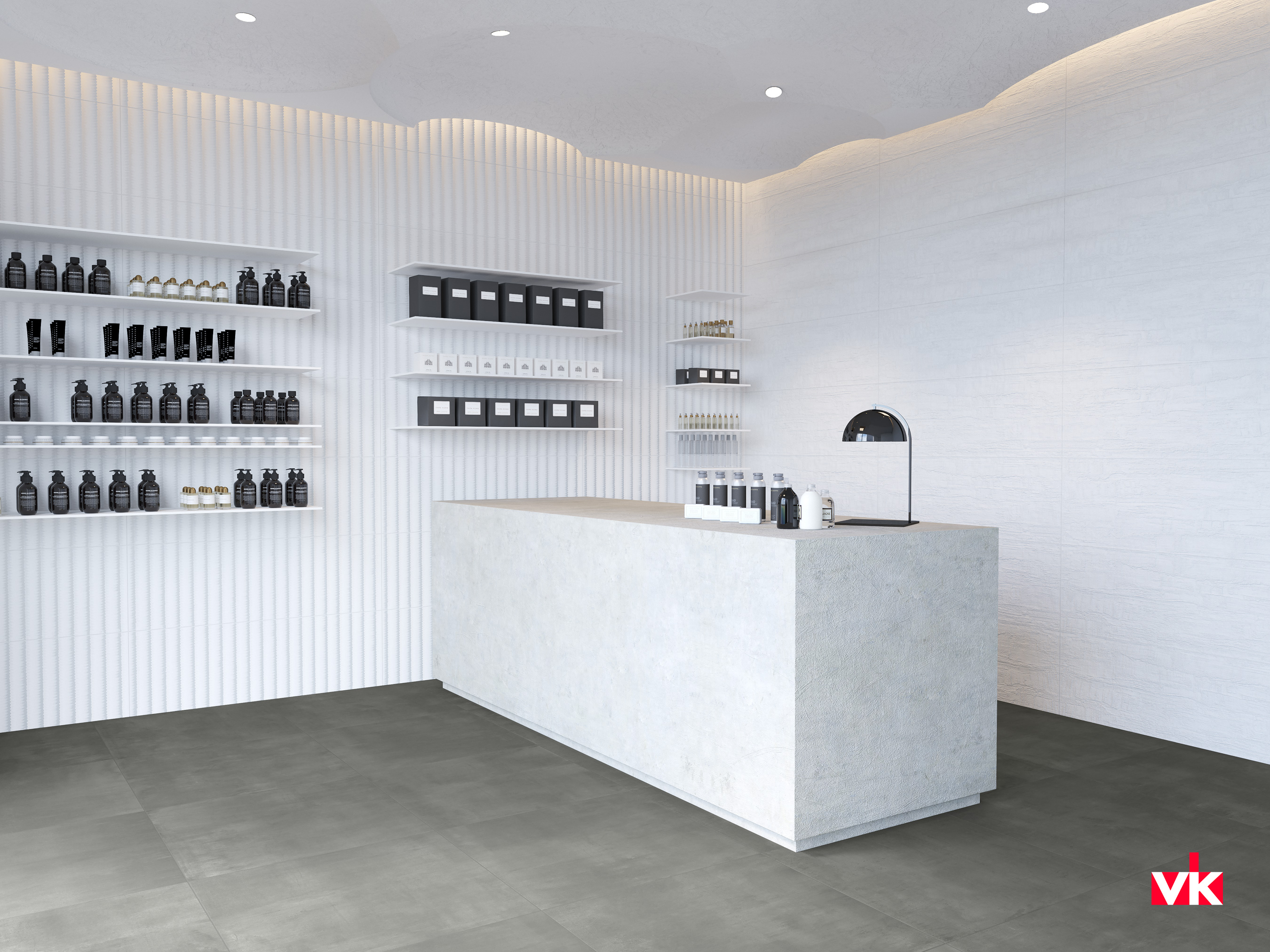 Базовая плитка имеет форму прямоугольника размером 300х600 мм. Чтобы придать интерьеру завершенный вид, в коллекции есть бордюры размером 10х600 мм. Поверхность плитки Essential может быть рельефной, матовой и полуматовой. На нее нанесен рисунок, имитирующий бетон, металл, также структурированная поверхность может иметь полоски.