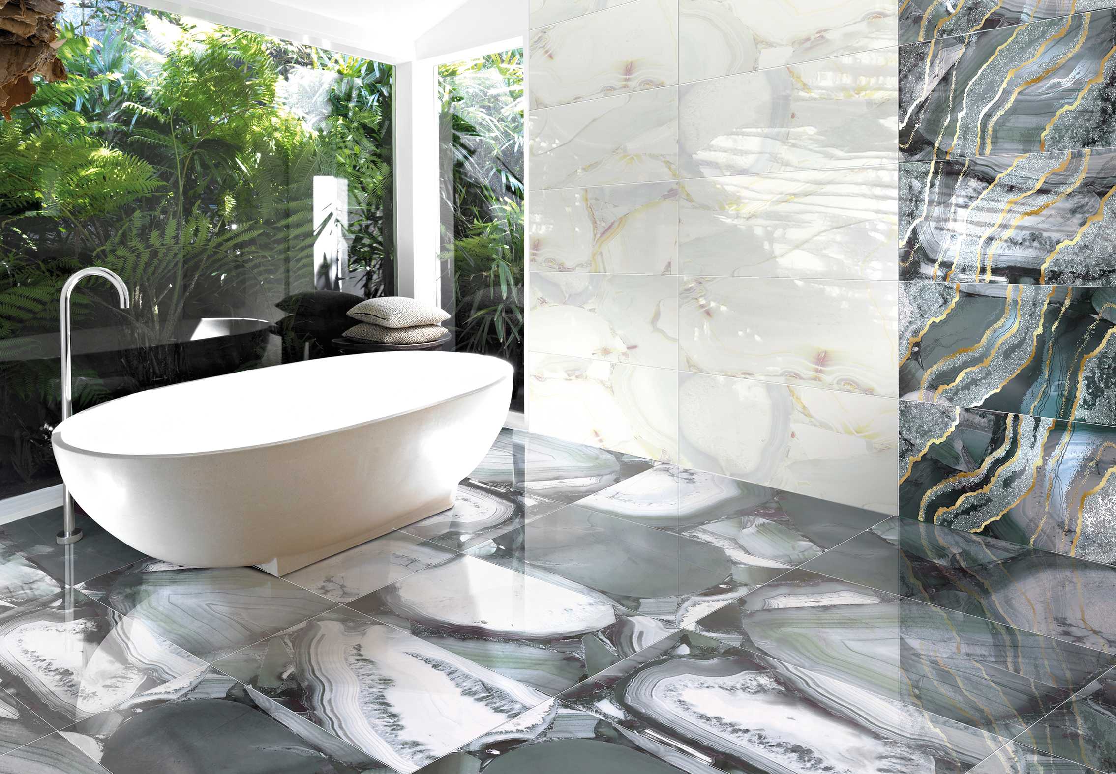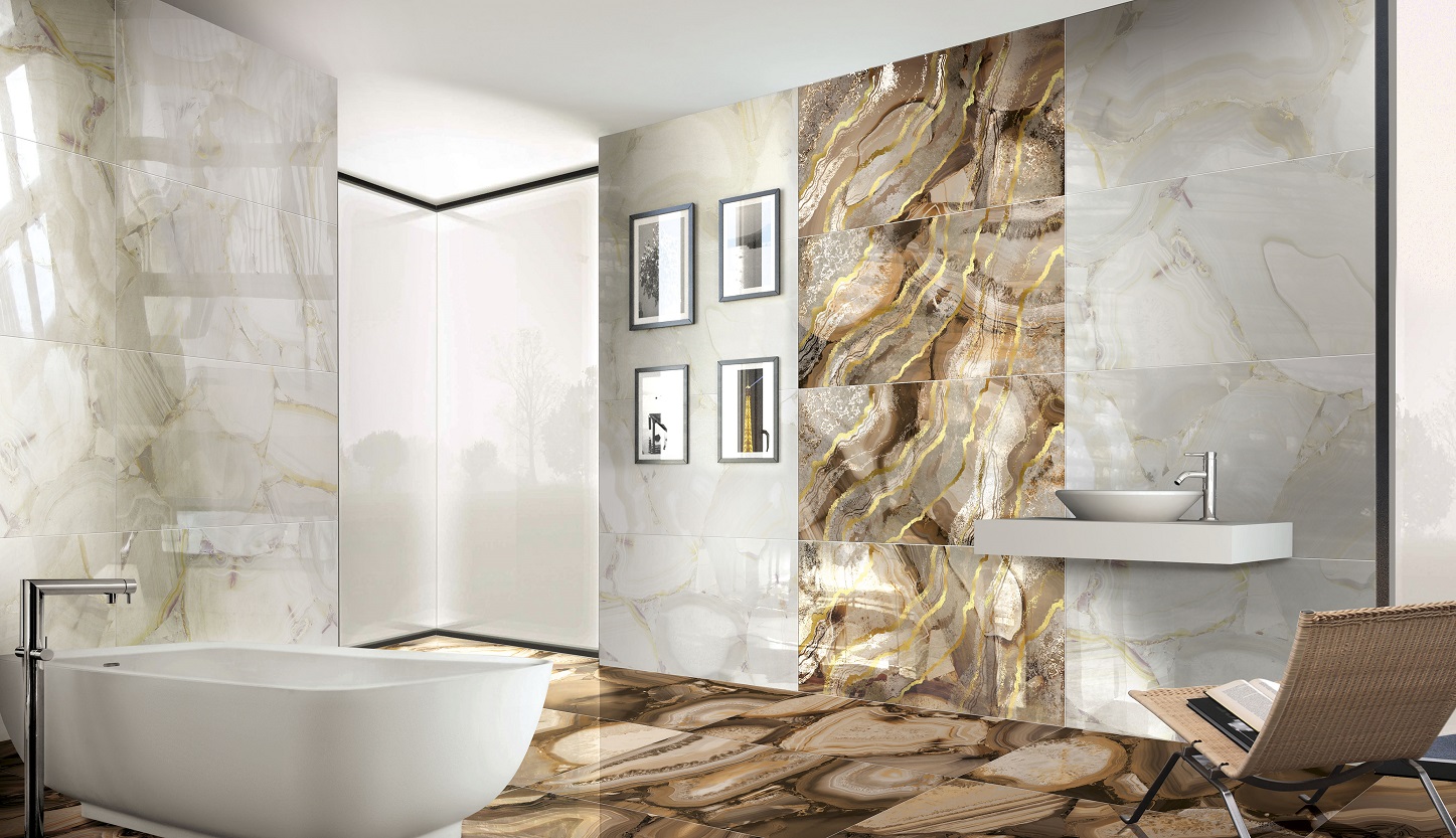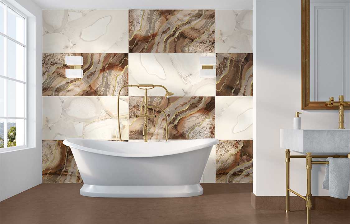 Плиткой Brennero Grandiosa можно выполнять отделку как стен, так и пола. Ее лаппатированная поверхность исключает скольжение даже, если на нее разлить воду, а также очень тонко выделяет текстуру. Визуально кажется, что материал сделан из натурального янтаря, нефрита или другого камня. Благодаря ректифицированным краям его можно укладывать с минимальным швом, что создает эффект непрерывности поверхности.