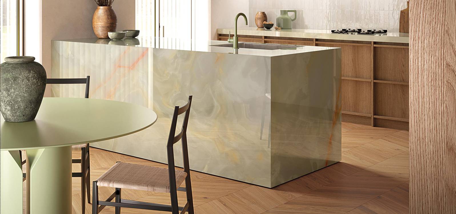 GEMME обладает неповторимой душой, выраженной в каждой плитке. Эта коллекция керамогранитных плит, имитирующих драгоценные камни, приносит в ваш интерьер великолепие, которое не поддается времени. Она идеально воссоздает текстуру и цвет оникса, визуально освещая и расширяя пространство ваших помещений.