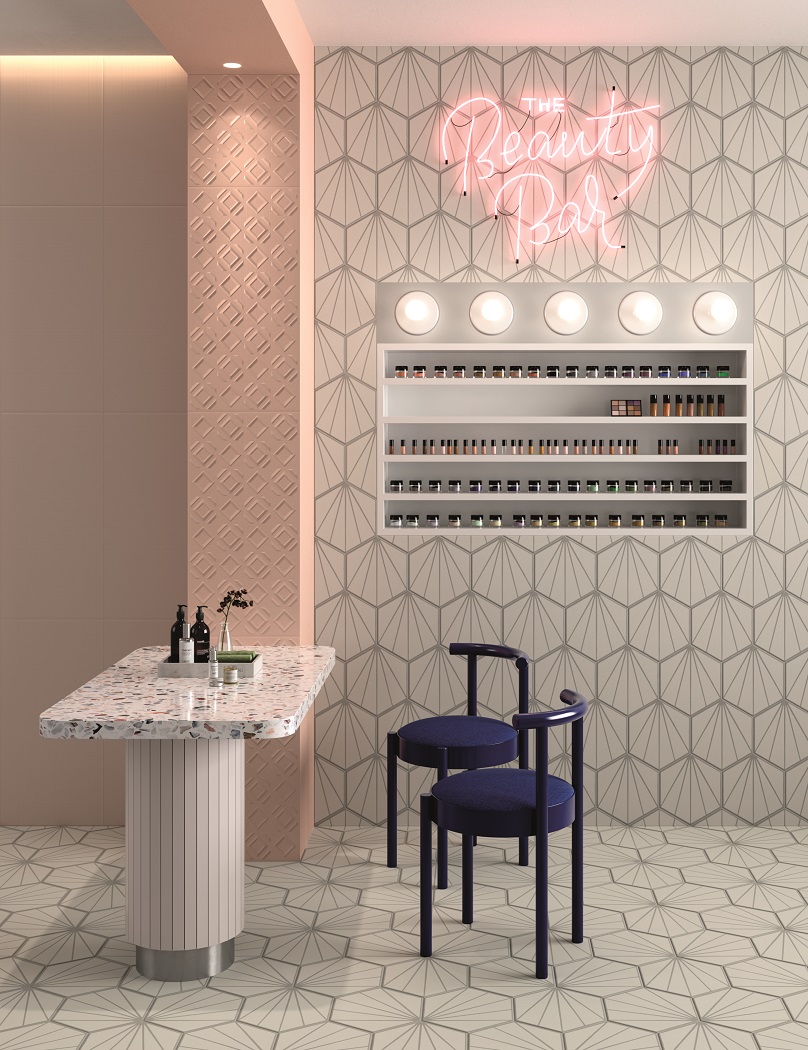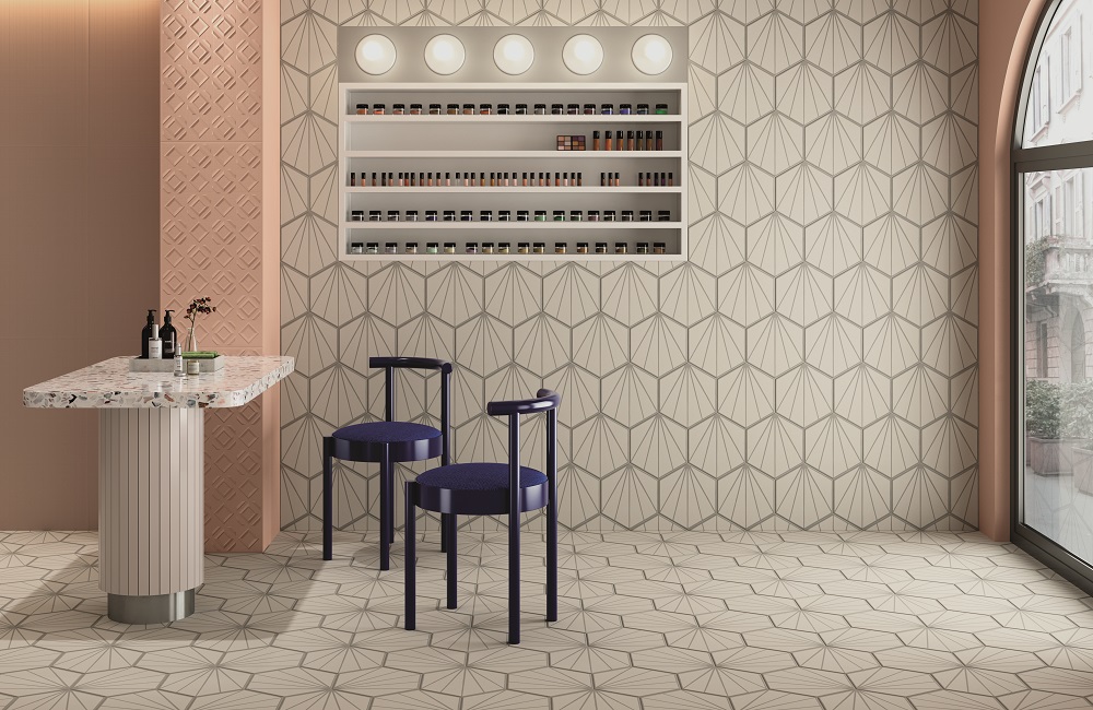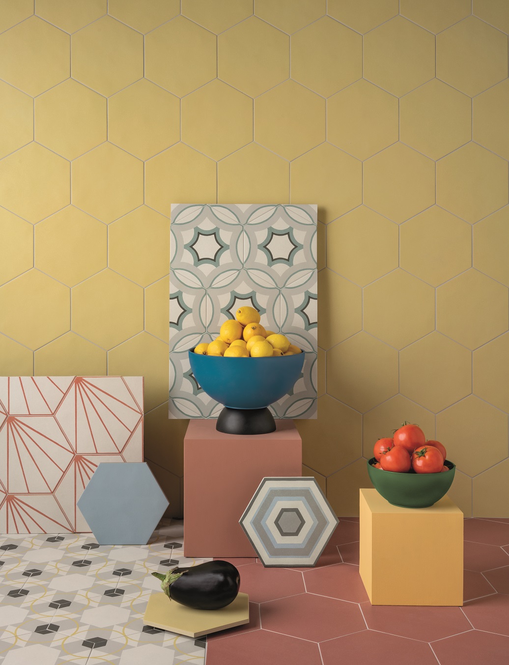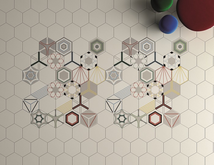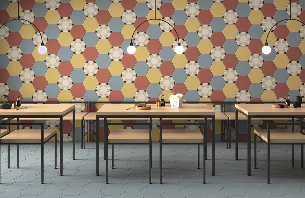 Керамическую плитку Paprica выпускают в форме шестиугольников размером 250х216 мм с матовой поверхностью. Она может иметь различные графические изображения или производиться в моноколоре. На выбор есть шесть цветовых решений: Nero, Bianco, Grigio (нейтральные тона); Senape, Blue, Aragosta (эксцентричные яркие цвета).