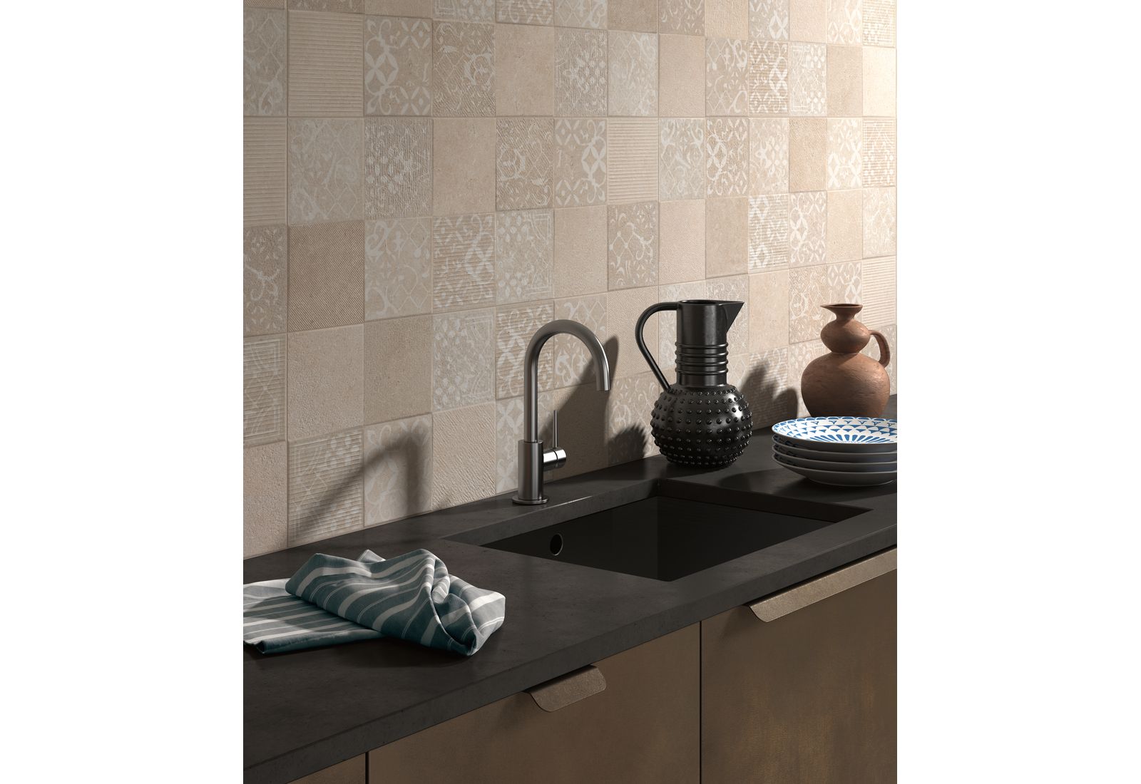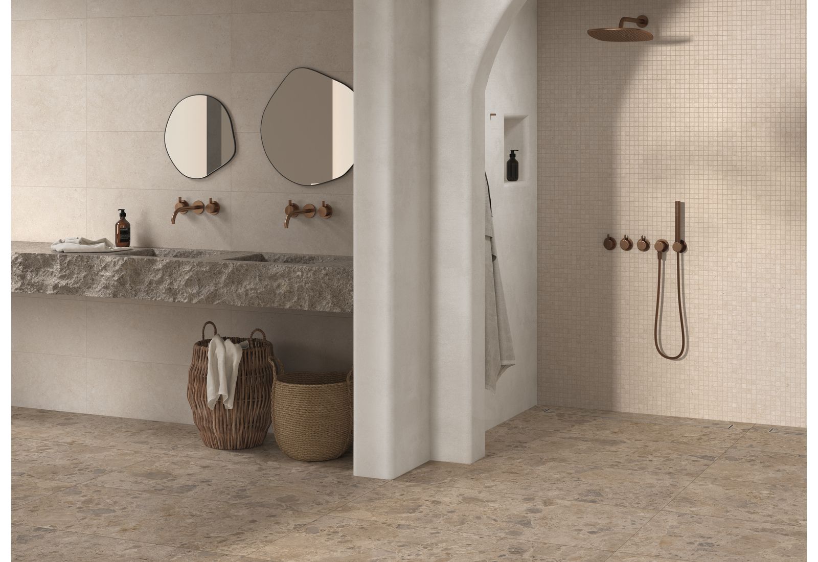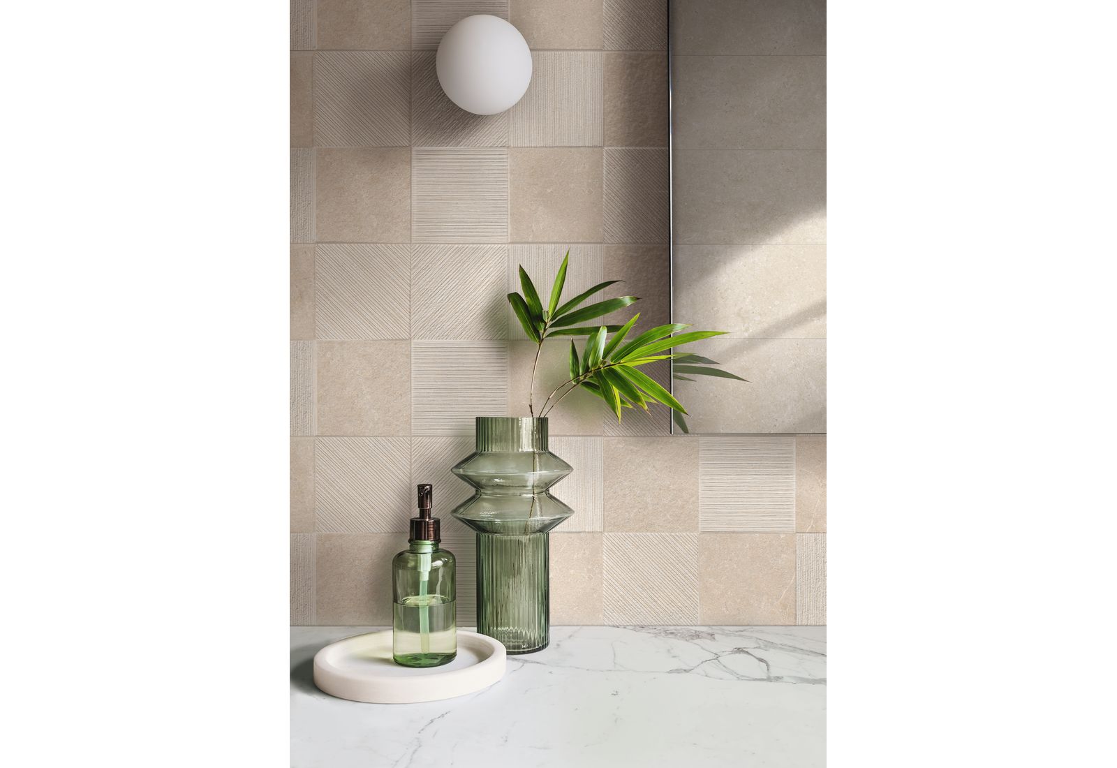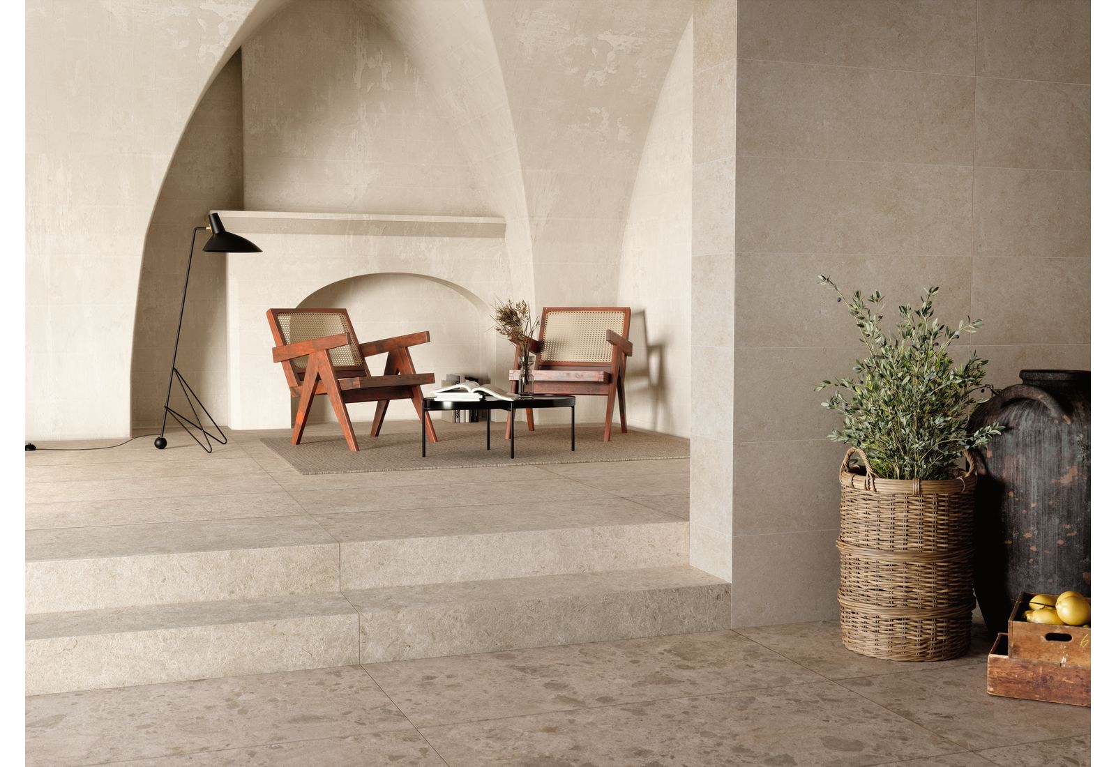 Ragno Eterna – это итальянская коллекция для оформления внутренних помещений дома и террас. Визуально плитка напоминает морские камни, позволяя оформлять интерьер в разных стилях. Коллекция включает элементы, выполненные в цветовых решениях Arena, Blanco, Greige, Mix Beige, Mix Gris, Mix Multicolor. «Оживить» монотонную картинку позволят вставки из темного мрамора.