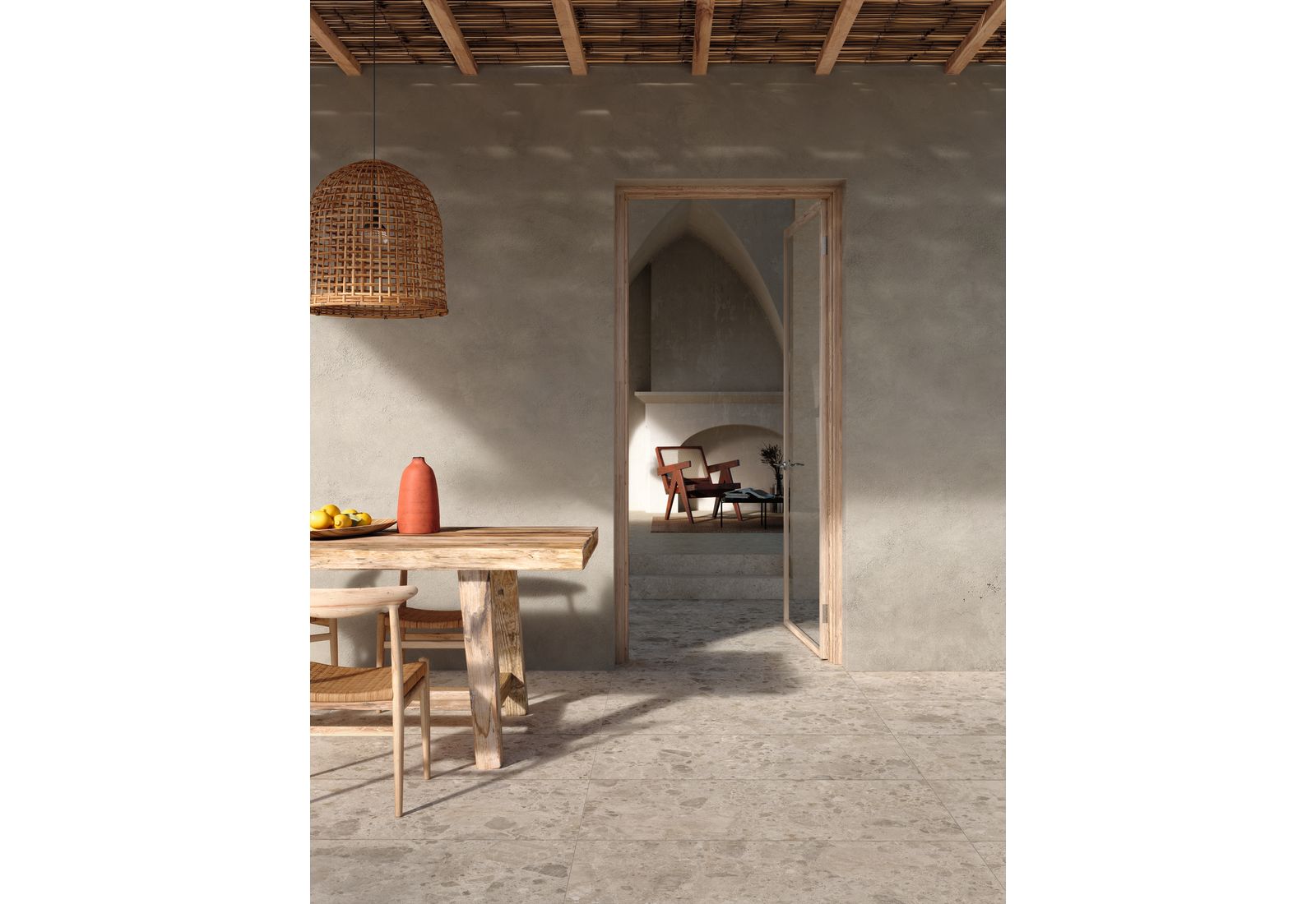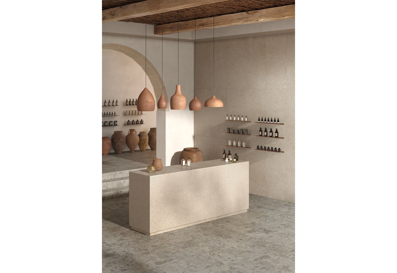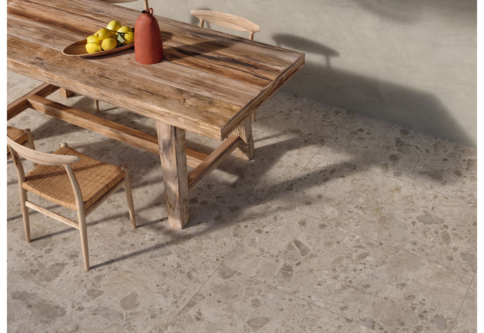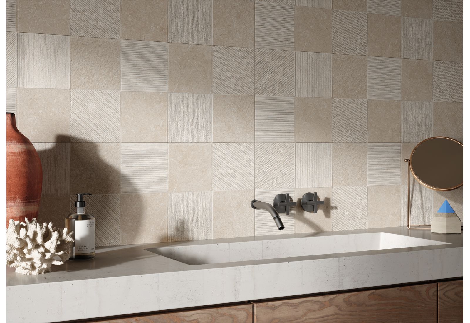 Ragno Eterna – это итальянская коллекция для оформления внутренних помещений дома и террас. Визуально плитка напоминает морские камни, позволяя оформлять интерьер в разных стилях. Коллекция включает элементы, выполненные в цветовых решениях Arena, Blanco, Greige, Mix Beige, Mix Gris, Mix Multicolor. «Оживить» монотонную картинку позволят вставки из темного мрамора.