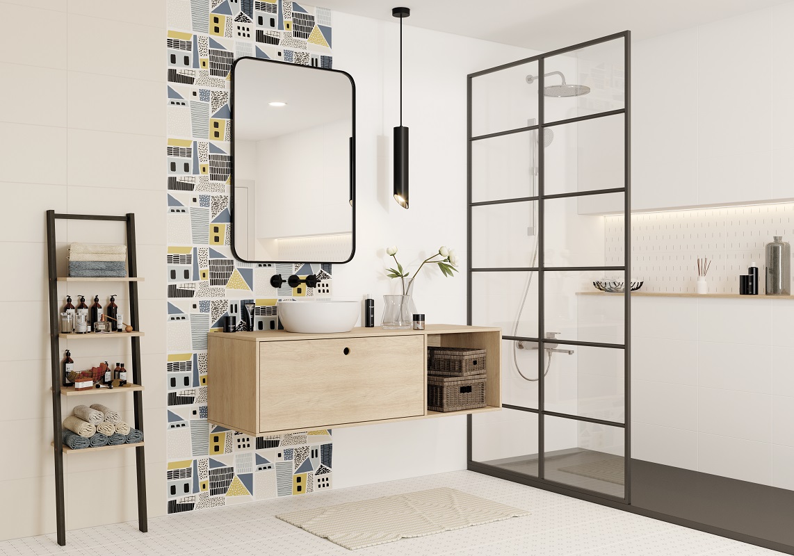 - Базовые элементы – однотонная матовая плитка в бежевых, зеленых и молочных оттенках прямоугольного формата 25х45 см.
